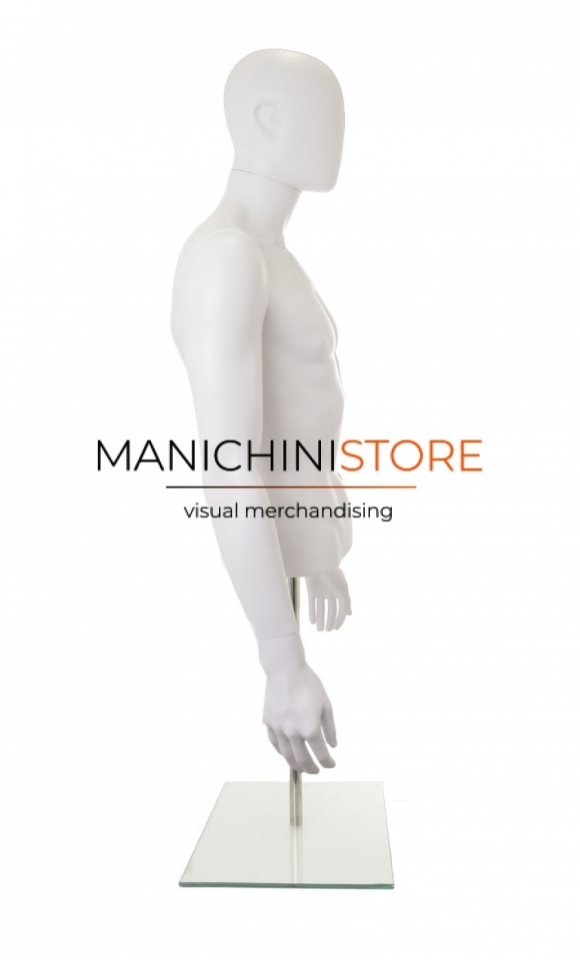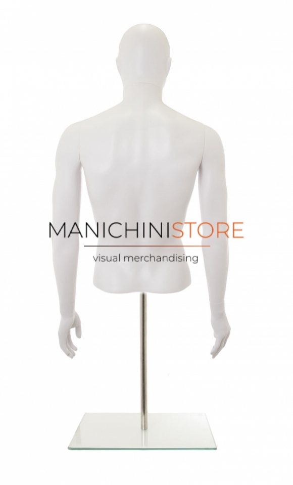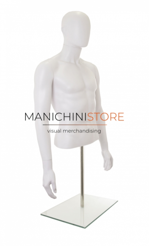 Beautiful male torso bust with arms and counter base, made of pre-colored white blown plastic.