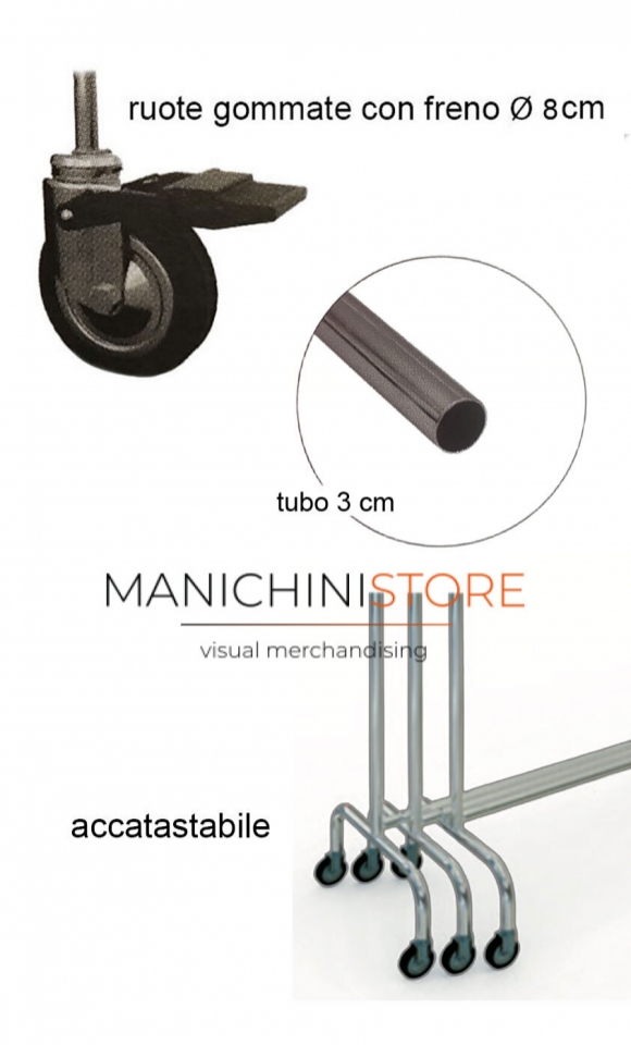 Practical, stackable fixed clothes rack made in Italy, with a round tube and wheels. Made of metal with a matte micaceous gray finish, similar to anthracite gray and with upper rod in chromed steel.