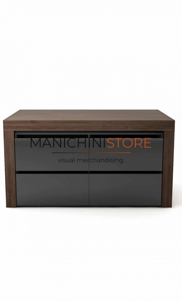 Display table in brown walnut melamine with eight drawers (4 on each side) mounted on soft-close runners and a glossy black melamine front.
