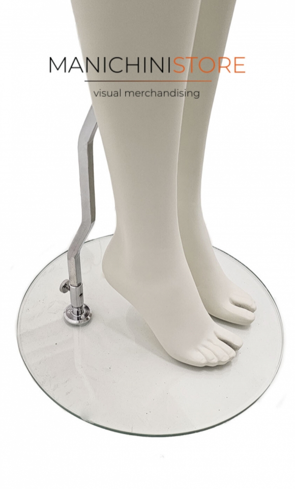 The mannequin features a 38 cm diameter round tempered glass base with a calf attachment that allows it to be worn with any type of footwear.