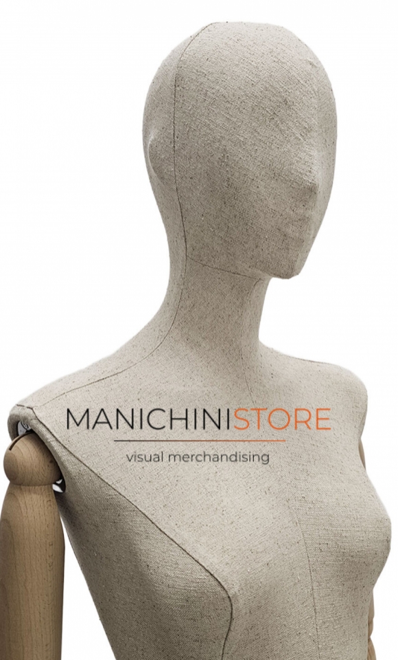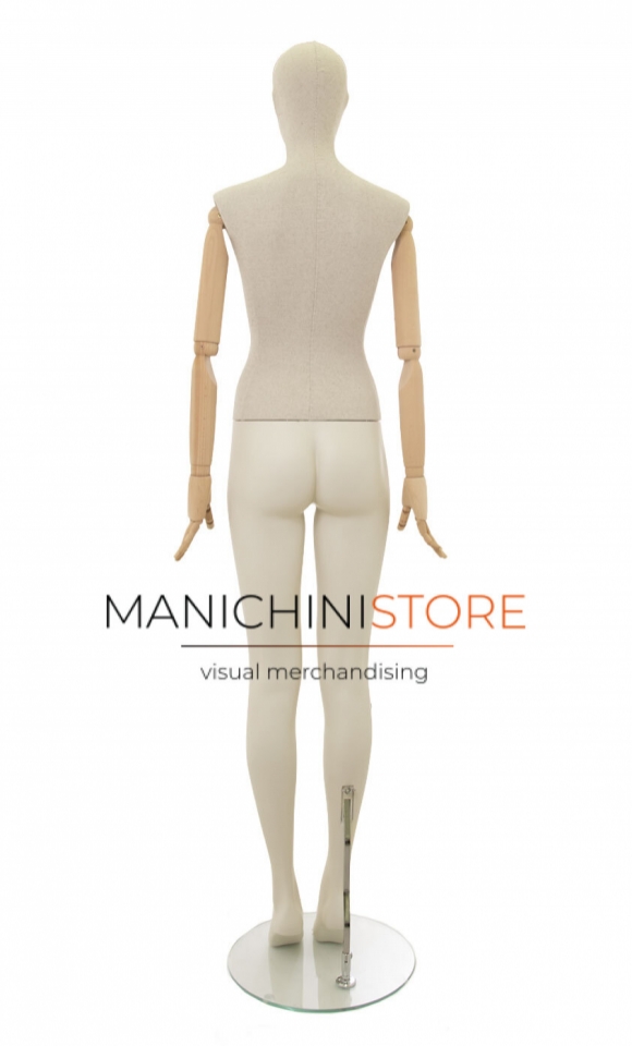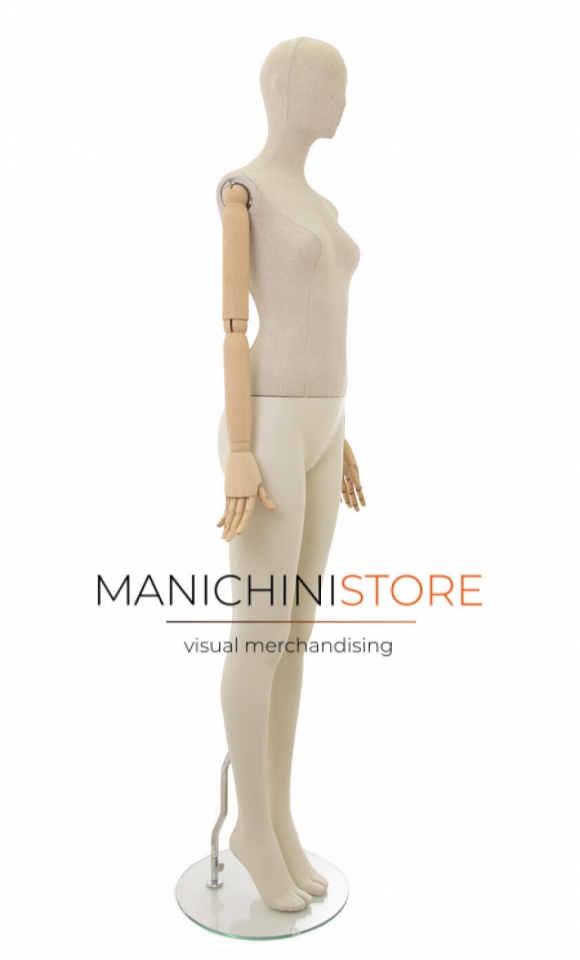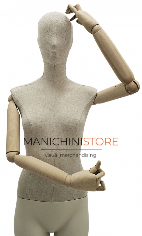 Sophisticated female mannequin from the ABSolute Collection, made in ABS, a plastic known for its durability, with legs painted in milk white, bust and head covered in fabric and articulated arms in natural wood.