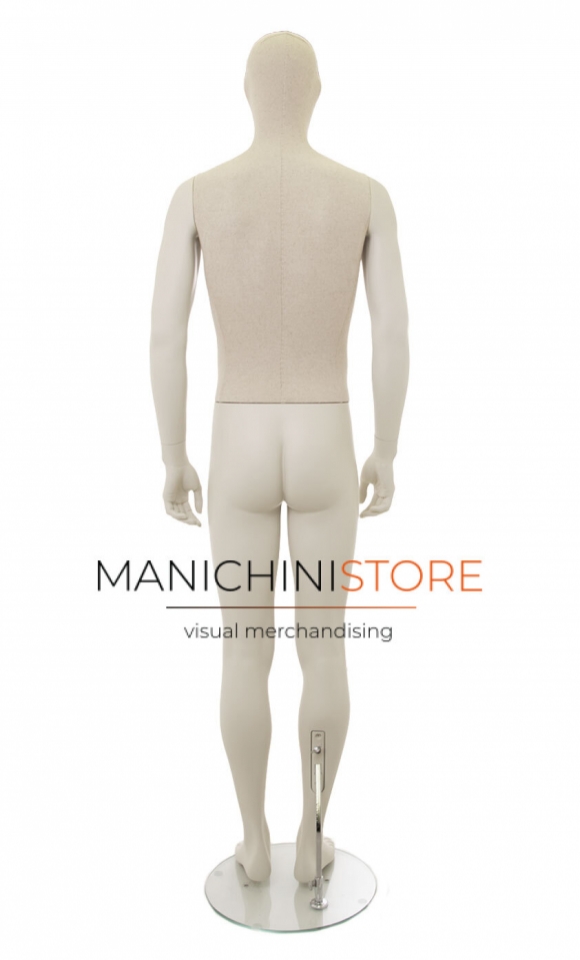 Sophisticated male mannequin from the ABSolute Collection, made in ABS, a plastic known for its durability, with legs and arms painted in milk white and torso and head covered in fabric.